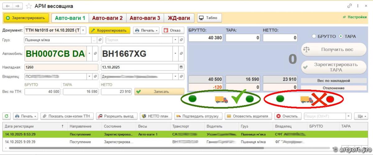 | Обмен данными | Передача статуса позиции (правильно/неправильно) и сигнала на разрешение взвешивания непосредственно в систему учёта. |
